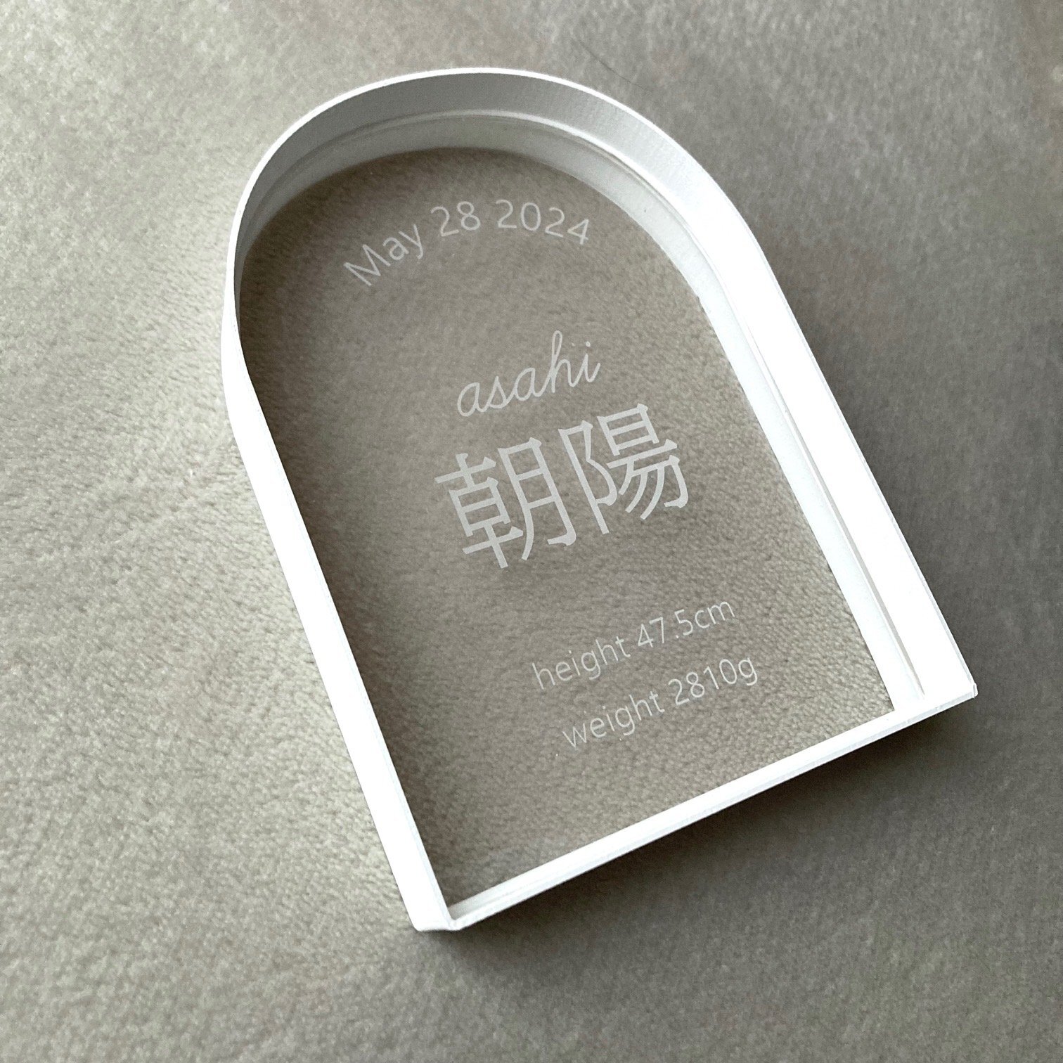 白の枠とアクリルの透明感、白文字が特徴の命名書です。