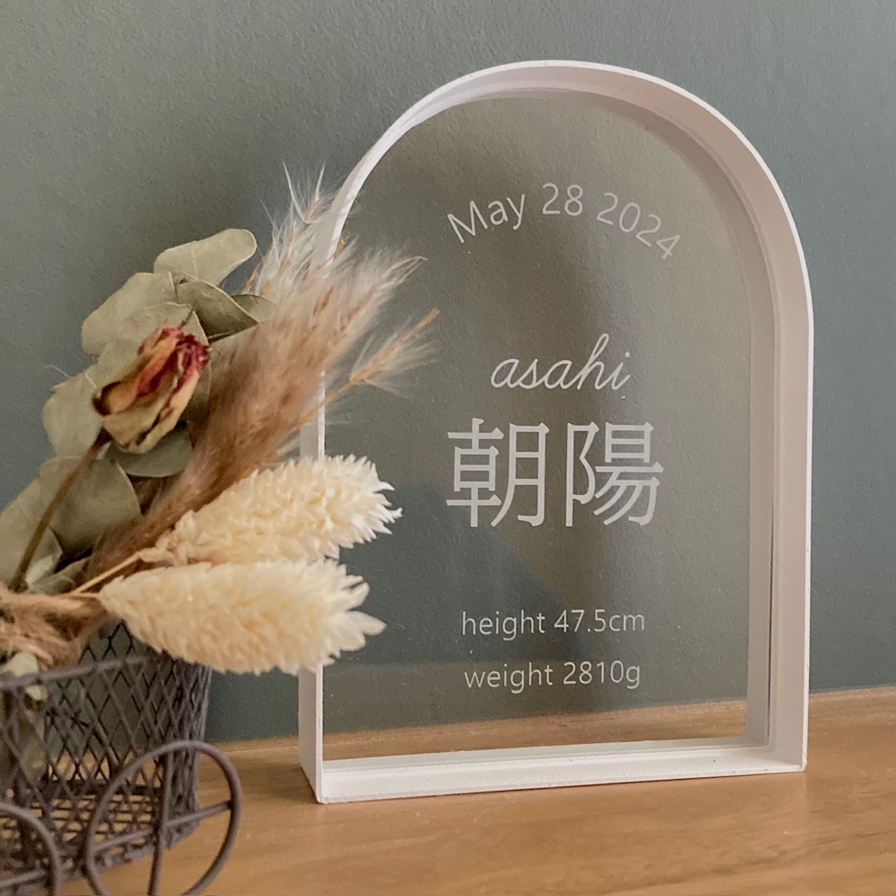 ・こちらの命名書は軽いですが、落下するとアクリルが外れたり枠が破損する場合がございますのでご注意下さい。