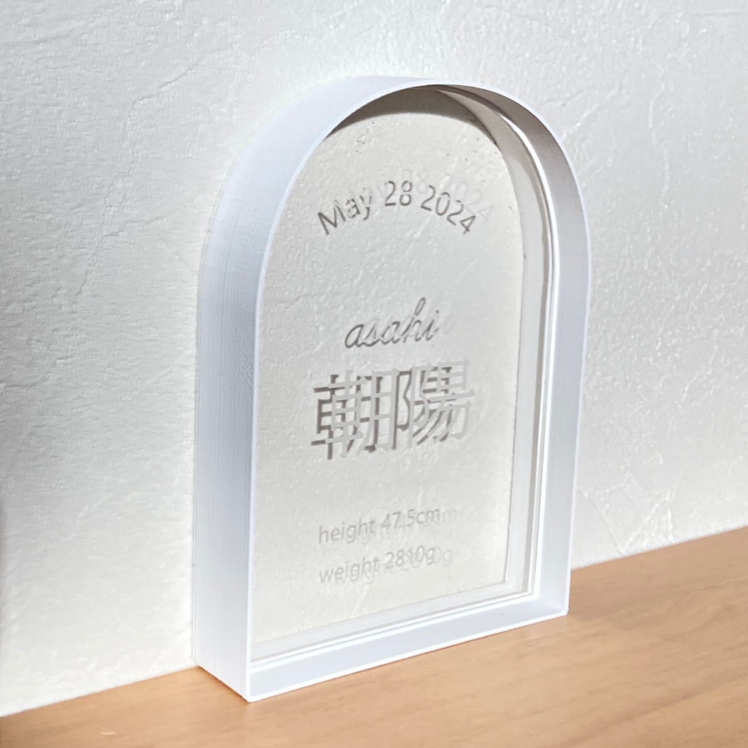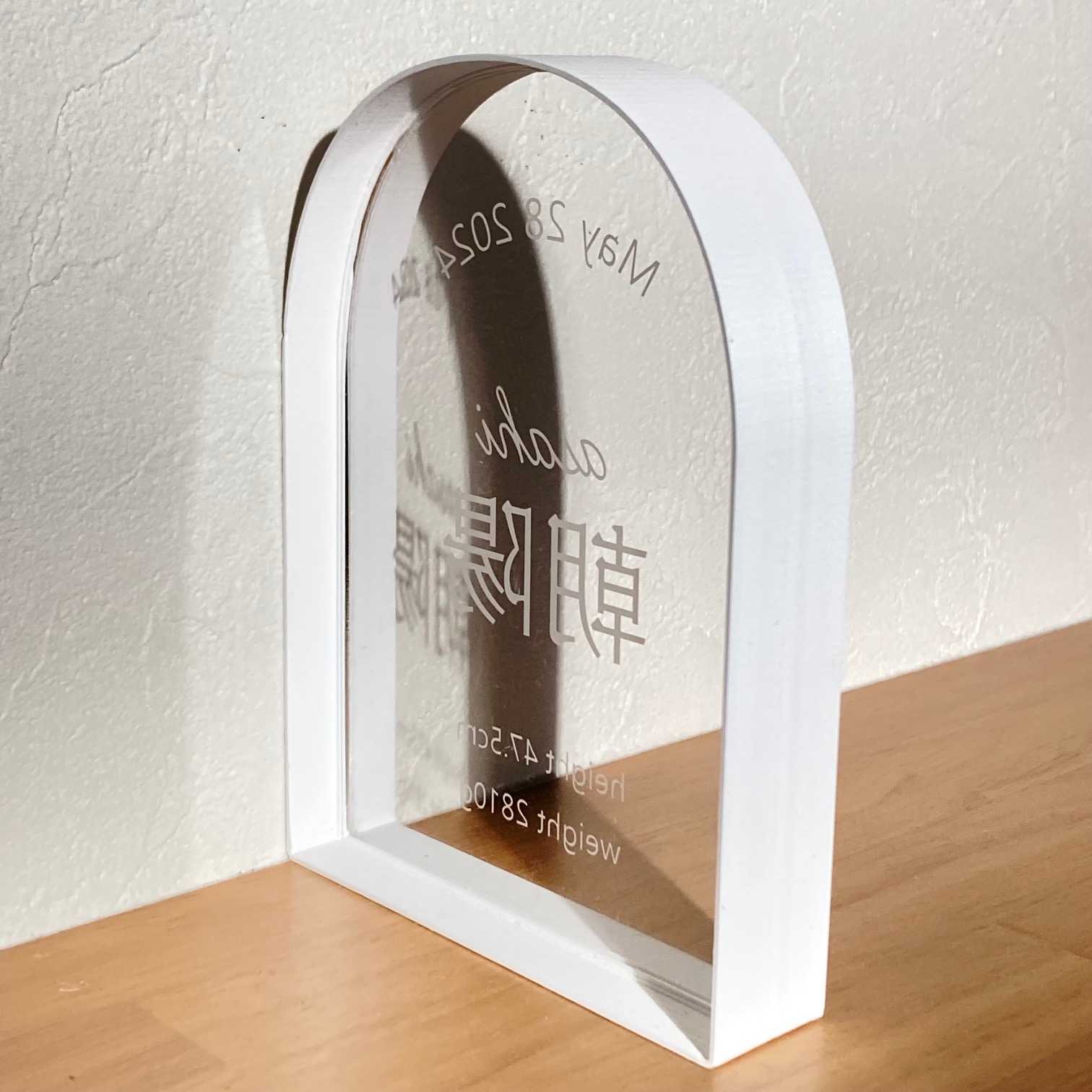 白の枠とアクリルの透明感、白文字の命名書
